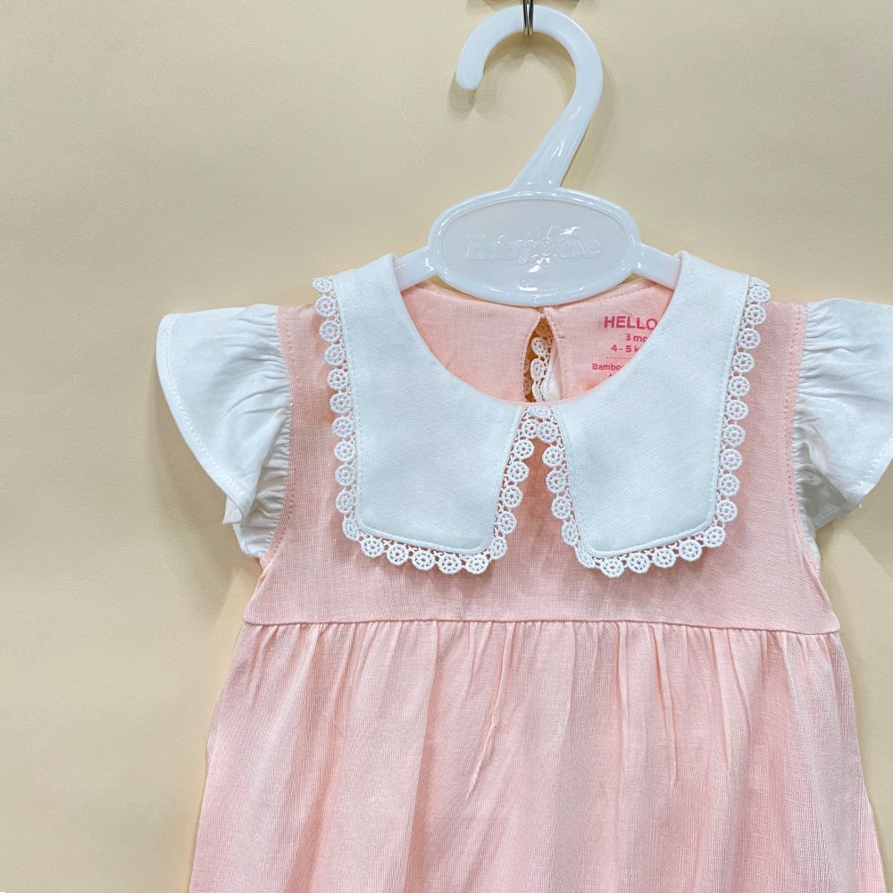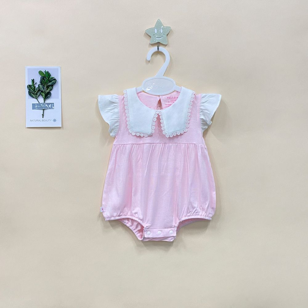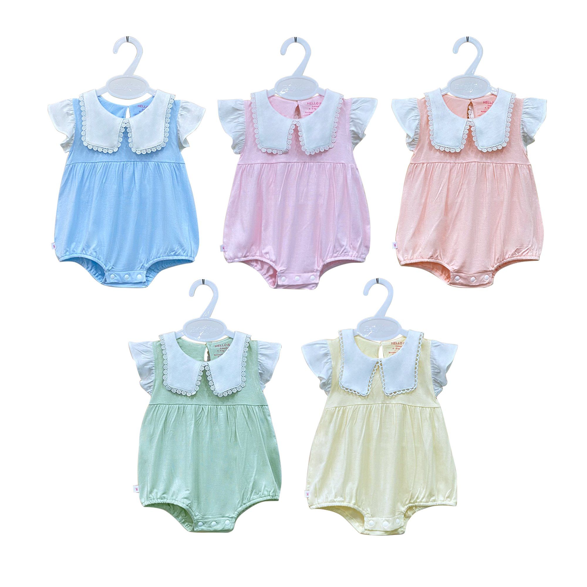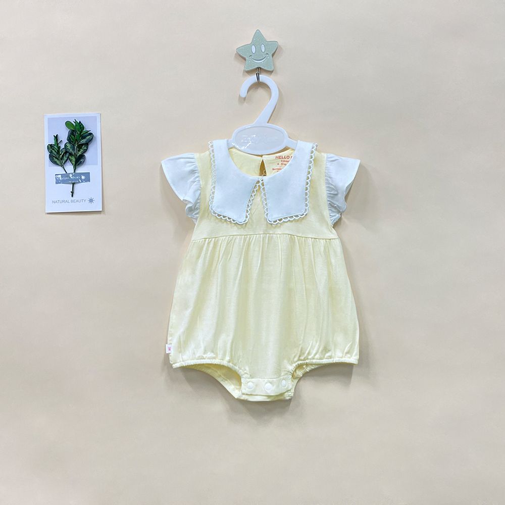 Kiểu dáng: Thiết kế bâu vuông thanh lịch, tay cánh tiên bồng nhẹ đáng yêu. Phom body liền quần tiện lợi, giúp bé thoải mái vận động mà không lo bị hở bụng hay cấn vướng. Nút bấm tiện dụng, giúp mẹ dễ dàng thay tã hay thay đồ cho bé.