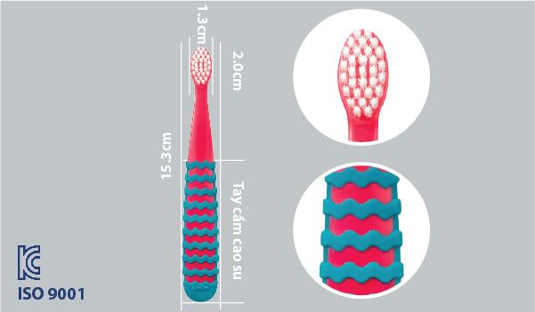 - Đầu bàn chải bo tròn và thon nhỏ vừa vặn với miệng bé và an toàn khi sử dụng.