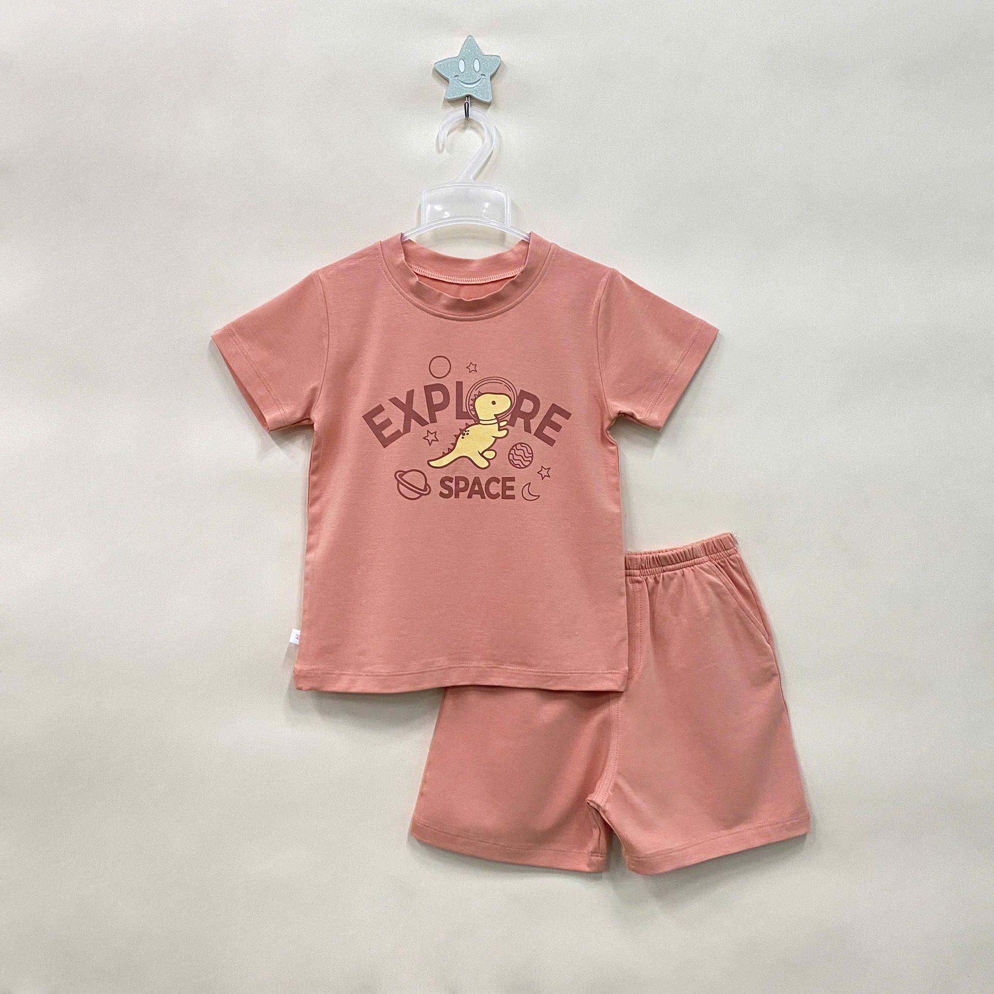 Kiểu dáng: áo cổ bo basic phối với quần short túi trông bé thật năng động & đáng yêu.