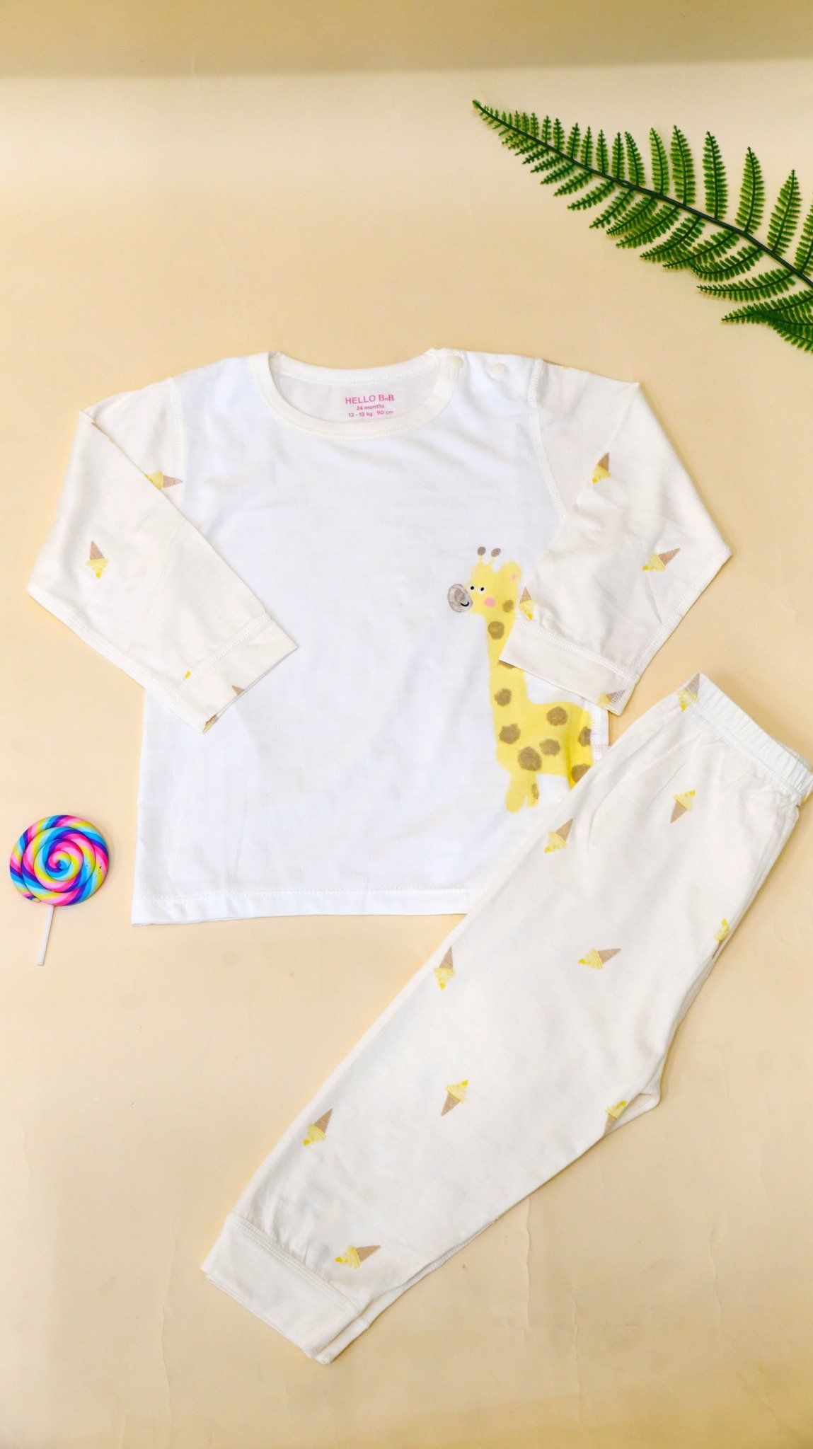 * Chất liệu sợi tre bamboo mềm mại, mịn màng, thoáng mát & kháng khuẩn. Nền vải in hình những chiếc que kem ngọt ngào, mát lạnh, thân trước áo có hình chú Hươu cao cổ nổi bật, siêu yêu.