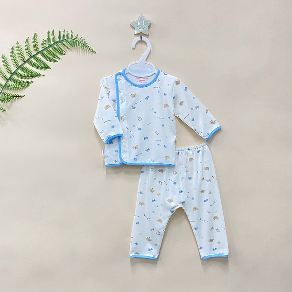 - Kiểu dáng: kiểu áo bác sĩ tay dài với hàng nút cài bên, in những họa tiết nhỏ xinh xắn kết hợp quần dài đáy nem đồng bộ trông bé thật đáng yêu. Đây là 1 trong những mẫu cơ bản cần có cho trẻ sơ sinh.