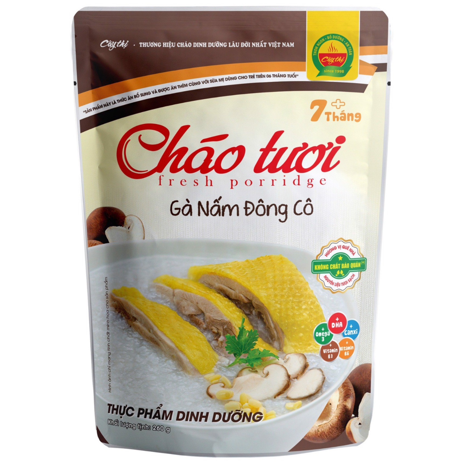 - Cháo tươi Cây Thị gà nấm đông cô sử dụng 100% nguyên liệu tự nhiên tươi sạch, không chứa chất bảo quản, đảm bảo an toàn vệ sinh khi sử dụng.