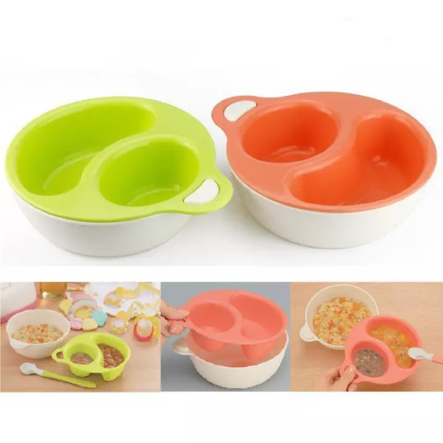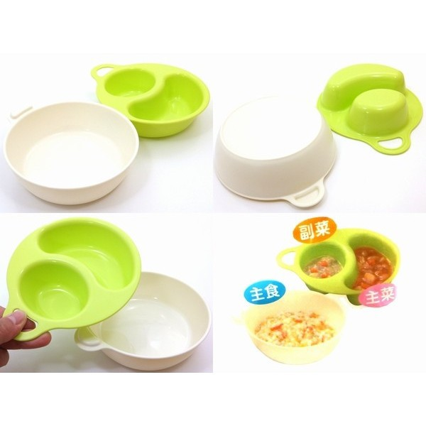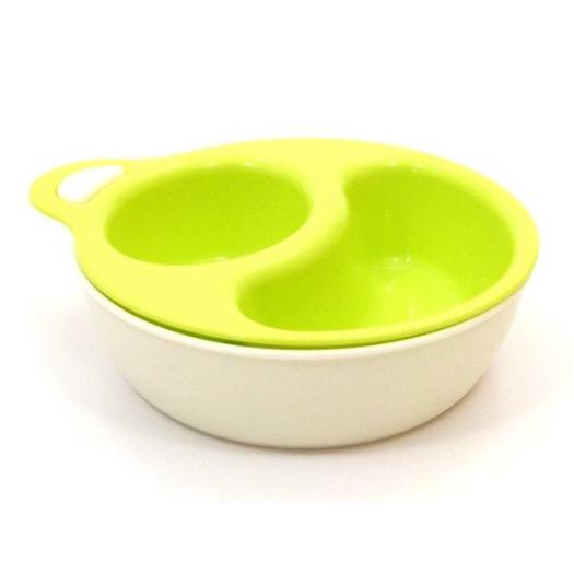 - Gồm 2 khay được lồng vào nhau. Khay trên được chia làm 2 ngăn nhỏ tiện dụng khi chia đồ ăn cho bé. Khay dưới rộng hơn, chứa được nhiều thức ăn hơn.