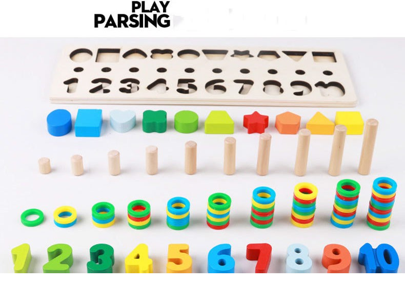 - Trọn bộ gồm: 10 cột gỗ, 10 con số, 10 khối hình học khác nhau và nhiều vòng tròn 7 sắc cầu vồng.
