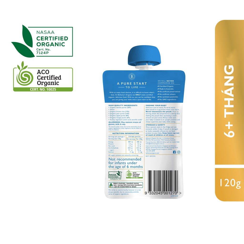- Hỗn hợp chuối, lê, táo và xoài với gạo lứt của Bellamy’s là một sản phẩm thơm ngon và tiện lợi, giúp bé làm quen với sự kết hợp của các hương vị trái cây.