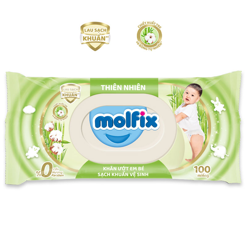 - Khăn ướt Molfix thiên nhiên sạch khuẩn dịu nhẹ tươi mát với bông Organic tự nhiên ( hộp 100 tờ )