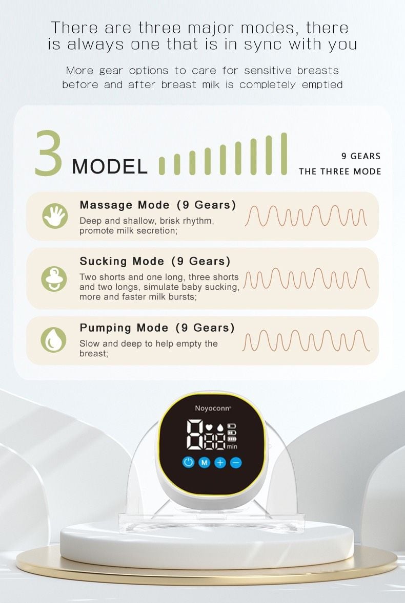 - Hút mạnh & mềm mại với 3 chế độ mat-xa, kích thích & hút sữa. mỗi chế độ có thể điều chỉnh 9 cấp độ từ thấp lên cao và ngược lại